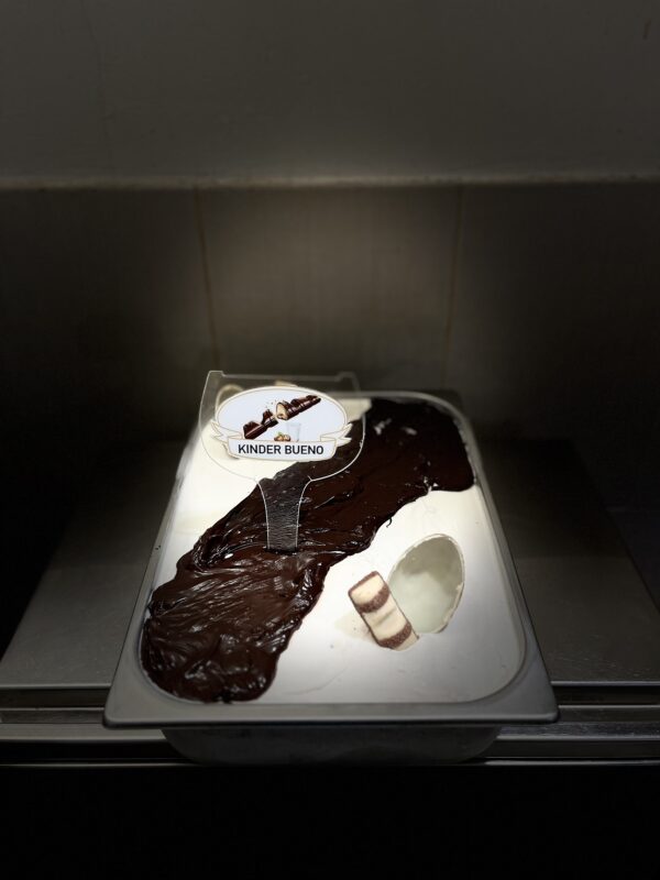 Kinder Bueno Gelato е совршена комбинација на детски спомени и гурманско уживање. Богато со кремасто лешниково полнење и фина млечна чоколада, секое залче е експлозија од вкусови што веднаш ги носи сетилата во светот на слатките задоволства. Нежната текстура и неодоливата крцкавост на чоколадниот слој создаваат совршен баланс меѓу мекоста и хрскавоста. Овој гелато го буди чувството на радост и задоволство, исто како кога ќе ја отвориш омилената чоколадна табла. Со секоја лажичка, уживаш во совршен спој на чоколадо и лешници што ги надминува сите очекувања
